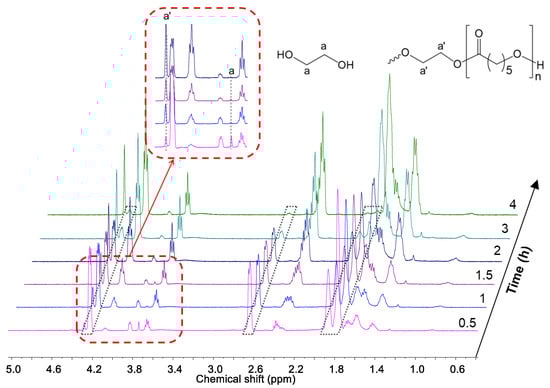 1H NMR (400 MHz, CDCl3) spectra of the PCL collected at different intervals. Conditions: DMC-IBN = 10 mg ([Zn]0 = 30 × mM), [CL]0 = 9 M, [CL]0/[EG]0 = 10, Tp = 160 °C. Dash lines denote the monomer signals.