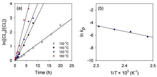 (a) First-order time–conversion plots of the batch polymerization of CL at different temperatures and (b) Arrhenius plot of the batch polymerization of CL. Conditions: DMC-EAA = 10 mg ([Zn]0 = 30 mM), [CL]0 = 9 M, [CL]0/[GL]0 = 20.