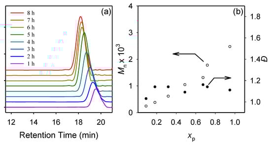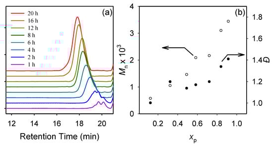 (a) GPC curves of PCL and (b) plots of Mn and Ð versus monomer conversion (xp) collected at different intervals. Conditions: DMC-EAA = 10 mg ([Zn]0 = 30 mM), [CL]0 = 9 M, [CL]0/[SB]0 = 20, Tp = 160 °C.