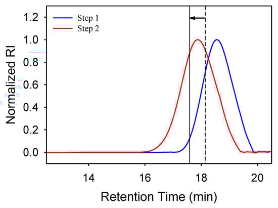 GPC curves of PCL collected during 2-step monomer addition. Conditions: DMC-EAA = 10 mg ([Zn]0 = 30 mM), [CL]0 = 9 M, [CL]0/[SB]0 = 10, Tp = 160 °C.