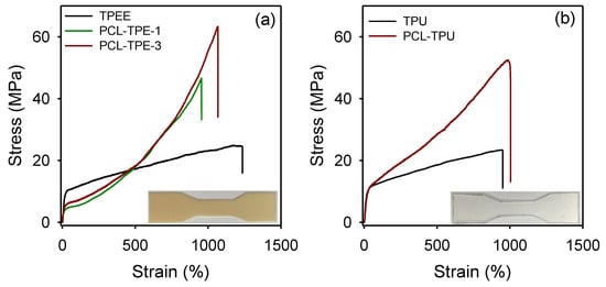 The rapid growth of the stress at low strain followed by a yielding and a more progressive growth of the stress with the strain (Figure 8) is relevant with a phase separated morphology where the hard segment domains act as reinforcing filler. The higher yield strength for PCL-TPU respect to PCL-TPEs could indicate more phase mixing due to hydrogen-bonds between the N–H groups of urethane linkages with C=O groups of PCL. The results of the mechanical tests are summarized in Table 6.