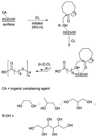 The ROP of lactones using stannous octoate and rare earth metal complexes have been widely established for the synthesis of polyesters [,]. Generally, the polymerization was conducted under homogeneous conditions to control the product properties and minimize side reactions (i.e., inter- and intramolecular transesterification). In addition to homogeneous systems, heterogeneous DMC catalysts are potential candidates for the ROP of cyclic carboxylic esters due to their high Lewis acidity and high stability, thus, they can be reused after recovering from the products.