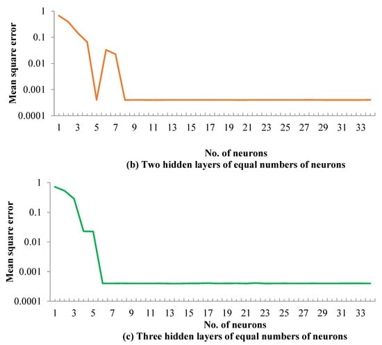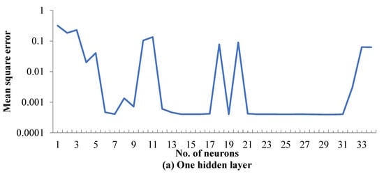 Different topologies with one, two, and three hidden layer(s) and varying numbers of neurons (1 to 34) in hidden layer(s) were iteratively tested to achieve the optimum topology. The mean square error (MSE) was used to quantify the performance of the neural network topology according to Equation (17):