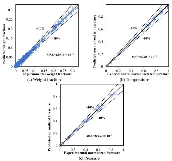 The datasets were divided into three parts: 70% for training, 20% for validation, and 10% for testing, which contained 28, 8, and 4 sub-datasets, respectively. Figure 5 displays a comparison between the real data and the predicted result from the ANN model during the training mode. The MSE was 4.0519 × 10−5, 5.0850 × 10−5, and 8.9327 × 10−6 for the weight fractions, temperatures, and pressures, respectively, while the average MSE for all data was 4.1085 × 10−5. The values of the MSE for temperature and pressure were lower than for the weight fractions. This was a result of the weight of the objective functions for temperature and pressure being higher than the weight of the weight fractions because the normalized variables for temperature and pressure fell within the range 0–1 while the weight fractions fell within the range from 0–0.26. The very low level of the predicted errors confirms the reliability of the proposed ANN model.