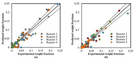 Comparison between the real and predicted weight fractions: (a) mathematical model, and (b) artificial neural network.