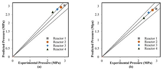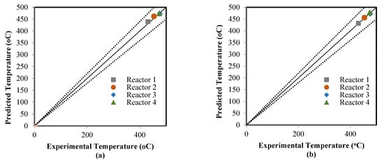 The ANN model that was validated in the learning mode was applied to estimate the model outputs in the testing mode; four sub-datasets were used in compassion between the actual data and predicted results. The catalyst deactivation term was already present in the two models, which included the ANN model as time normalized from 0–1225 to 0–1 and also added the kinetic model to achieve the predictions of the RMM model. Figure 6, Figure 7 and Figure 8 show a comparison between the actual and predicted results using the ANN and RMM, while the summary of the predicted errors of two models is illustrated in Table 6. Figure 6a,b represents a comparison between the actual and predicted weight fractions obtained by the RMM and ANN models, respectively. The corresponding values of the R2, MAE, and MSE error functions achieved by the ANN model were 0.9403, 0.0062, and 0.002044, respectively, while for the RMM model, they were 0.9318, 0.0070, and 0.0002284, respectively. The MRE does not calculate for the weight fractions because some real values (those that were equal to zero) displayed an infinite relative error. Comparisons between the real and predicted outlet reactor temperatures obtained by the RMM and ANN models are presented in Figure 7a,b, respectively. The corresponding values of the R2, MAE, MRE, and MSE error functions achieved by the ANN model were 0.9736, 2.2246, 0.4774 and 21.6587 respectively, while for the RMM model, they were 0.8951, 4.0939, 0.5679 and 37.329, respectively. Figure 8a,b shows a comparison between the actual and predicted outlet reactor pressures obtained by the RMM and ANN models, respectively. The corresponding values of the R2, MAE, MRE, and MSE error functions achieved by the ANN model were 0.9467, 0.4010, 1.4129, and 1.1988, respectively, while for the RMM model, they were 0.4859, 1.6248, 6.4959, and 5.303, respectively. For the RMM model, the lower value of R2 in the case of pressure can be attributed to the fact that the error in pressure was accumulative from the first reactor to last one, in contrast to the temperature, whereas the heat exchangers were used to heat the feed to the required temperature before entering each one of these four reactors, so there would be no accumulative error. From these figures, close mappings between the measured and simulated weight fractions, temperatures, and pressures can be observed for the two models.