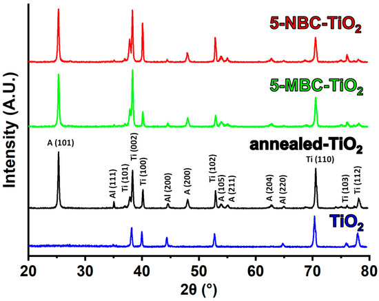 XRD pattern of as-formed (blue line) and crystalline TiO2 nanotubes (black line), 5-MBC-TiO2 (green line), and 5-NBC-TiO2 (red line). The peak labels are indicated as follows: A = Anatase, Ti = Titanium (substrate), Al = Aluminum (sample holder).