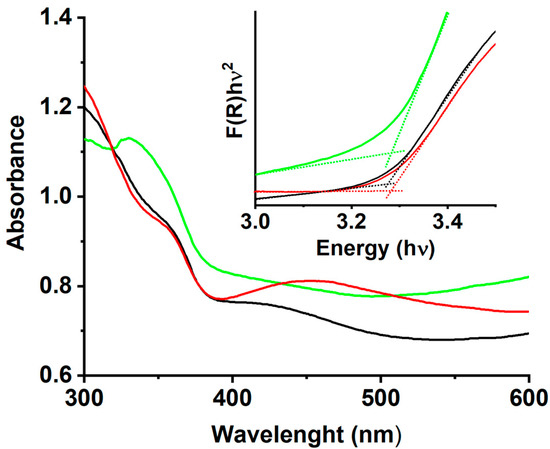 DR-UV spectra of bare TiO2 nanotubes (black line), 5-NBC-TiO2 (red line), and 5-MBC-TiO2 (green line). Inset: Kubelka–Munk plots for the samples.