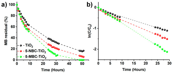 Based on these results, the most active materials, i.e., 5-NBC-TiO2 and 5-MBC-TiO2, were studied in view of their photocatalytic activity during longer experiments (up to 51 h) to assess their (photo) stability and gain insights into the degradation kinetics. MB degradation profiles are shown in Figure 9.