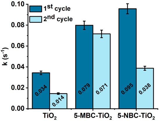 As can be observed for the long kinetics experiments, the MBC-decorated TiO2 is the most efficient photocatalyst for the degradation of MB, doubling the reaction rate compared to bare TiO2 (see Figure 10) and completely mineralizing the dye within 48 h. In contrast, undecorated and nutshell-derived materials were unable to completely degrade the azo dye and exhibited a less efficient behavior, even though 5-NBC-TiO2 performs even better than 5-MBC-TiO2 within the first 3 h (see Figure 8 and Figure 10). This behavior might be ascribed to a poisoning effect induced by methylene blue which is more marked for TiO2 and 5-NBC-TiO2 rather than for 5-MBC-TiO2. A second 3-h MB degradation was then performed on the catalysts used to assess if a partial deactivation could be observed. As can be seen in Figure 10, both TiO2 and 5-NBC-TiO2 show a marked deactivation, while 5-MBC-TiO2 shows only a slight decrease in its photocatalytic efficiency.