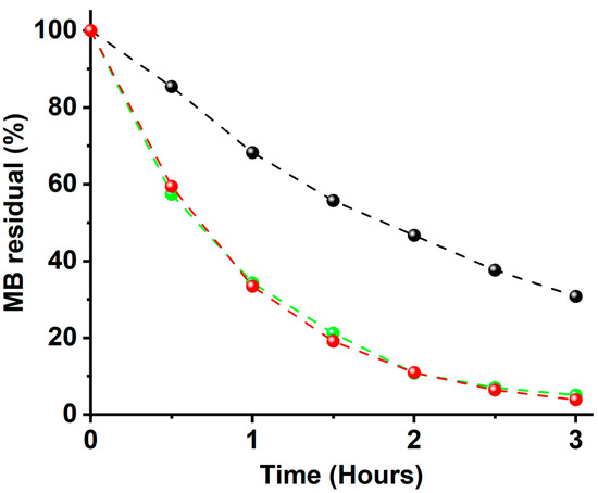 Kinetic curve obtained for MB photocatalytic degradation using bare TiO2 (black line), 5-MBC-TiO2 (green line), and 5-NBC-TiO2 (red line) under boosted conditions.