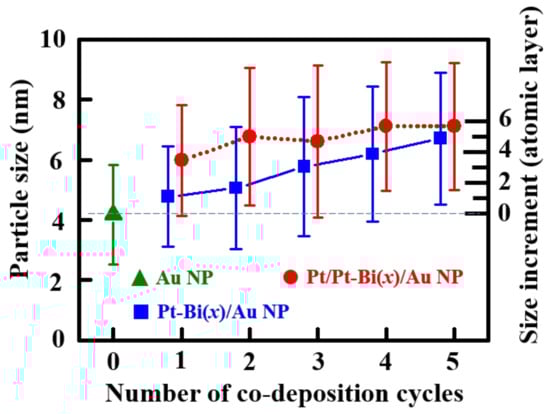 Figure 1 demonstrates the particle size variations of Pt-Bi/Au NPs and Pt/Pt-Bi/Au NPs as a function of the number of co-deposition cycles. The average particle sizes were extracted using the particle size distributions measured with TEM (Figure S1). The particle sizes of Pt-Bi/Au NPs certainly increase as the co-deposition cycle is repeated. For instance, the particle size of a plain Au NP (4.2 ± 1.7 nm) increases to 6.7 ± 2.2 nm after the fifth co-deposition cycle, i.e., the size of Pt-Bi(5)/Au NP. This specific size increment of ~2.5 nm roughly corresponds to the thickness of four or five atomic layers on the Au NP, which is more or less similar to that of Pt-Bi co-deposits on a Au disk (six to seven layers) prepared using an identical procedure of co-deposition but with rinsing with water []. On the other hand, the sequential deposition of Pt over Pt-Bi co-deposits further increases the particle sizes. Specifically, the thickness of the additional Pt layer on Pt/Pt-Bi(1)/Au NP corresponds to three atomic layers approximately, while that on Pt/Pt-Bi(5) Au NP is slightly less than two layers. Thus, the thickness of Pt-containing layers on Pt/Pt-Bi/Au NPs spans roughly from four to six atomic layers.