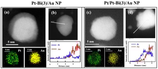 STEM results of Pt-Bi(3)/Au NP and Pt/Pt-Bi(3)/Au NP. (a) and (c) are respective elemental mappings of Pt-Bi(3)/Au NP and Pt/Pt-Bi(3)/Au NP; (b) and (d) are respective line profiles of Pt-Bi(3)/Au NP and Pt/Pt-Bi(3)/Au NP.