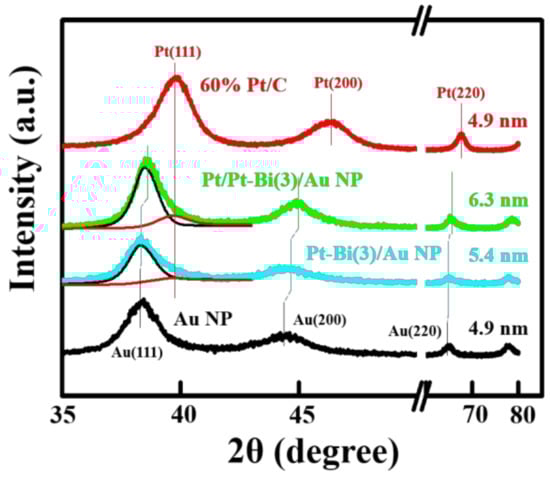 The amounts of deposited Pt and Bi were determined semi-quantitatively using inductively coupled plasma atomic emission spectroscopy (ICP-AES) and X-ray photoelectron spectroscopy (XPS). For ICP-AES measurements, the investigated catalysts were completely dissolved in an aqua regia solution for 10 h. The solutions, after proper treatments, were injected into an ICP-AES instrument (Optima 7300DV; PerkinElmer, Waltham, MA, USA) to determine the concentrations of Pt, Bi and Au. For XPS measurements, an XPS instrument (KAlpha+ XPS spectrometer, Thermo Scientific, Waltham, MA, USA) was operated with a monochromatic Al-Kα X-ray beam (1486.7 eV) and with a hemisphere energy analyzer with a pass energy of 50.0 eV. The peak area ratios of Pt to Au were converted to corresponding atomic ratios using the sensitivity factors of 1.9 and 1.75 for Au and Pt, respectively []. Because the Bi amount was close to the detection limit, further quantitative analysis was not carried out.