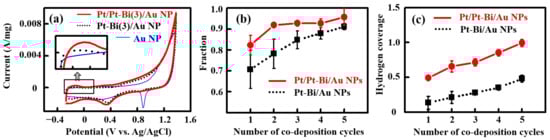 Figure 5b displays the fraction of the Au surface covered by co-deposits as a function of the number of co-deposition cycles. The fraction of covered Au surface was estimated using a ratio of the Au oxide reduction charge of a Pt-Bi/Au NP or Pt/Pt-Bi/Au NP to that of the plain Au NP. Figure 5b reveals that the fraction of covered Au surface of Pt-Bi/Au NP increases from ~0.7 to ~0.9 as the co-deposition cycle is repeated. After the subsequent deposition of Pt, the further increases in fraction support the notion that additionally deposited Pt resides simultaneously on the pre-existing co-deposits and the uncovered Au surfaces (most likely in small spaces between the co-deposits). On the other hand, the hydrogen coverage of Pt-Bi/Au NP (Figure 5c) certainly increases as the co-deposition cycle is repeated; moreover, the subsequent deposition of Pt on Pt-Bi/Au NPs increases the hydrogen coverage significantly. Despite a qualitative similarity between the variations in hydrogen coverage and the Pt/Au ratios, the hydrogen coverage of Pt-Bi/Au NPs and Pt/Pt-Bi/Au NPs is worth discussing quantitatively in detail. For instance, the fraction of the covered Au surface of Pt-Bi(3)/Au NP is ~0.8, which would be the value of hydrogen coverage if the hydrogen adsorption stoichiometry is 1, neglecting the influence of Bi to Pt in hydrogen adsorption (due to a trace level amount of Bi). However, the observed hydrogen coverage is ~0.3, suggesting that the hydrogen adsorption stoichiometry of Pt-Bi(3)/Au NP is apparently ~0.4 (≈ 0.3/0.8). The hydrogen adsorption stoichiometries of Pt-Bi/Au NPs, estimated in this way, range from 0.2 to 0.5, while those of Pt/Pt-Bi/Au NPs span from 0.6 to 1.0. Deviation in the hydrogen adsorption stoichiometry of Pt from the conventionally accepted value of 1 was demonstrated on Pt deposit model catalysts on Au, whose shapes and populations were controlled []. Specifically, the hydrogen adsorption stoichiometry on the atomically rough stepped surfaces of cone-shaped Pt deposits on the Au disk was reported to be 0.5. It is possible that the severe removal of Bi during H2SO4 solution rinse may give rise to the development of poorly crystallized Pt-Bi deposits of quite rough surfaces in atomic scale, resulting in poorly coordinated surface Pt atoms, reducing the hydrogen adsorption stoichiometry. The subsequent deposition of Pt on Pt-Bi(3)/Au NP increases the hydrogen coverage from ~0.3 to ~0.7 (Figure 5c). The particular increment of 0.4 would not indicate an increase in the number of surface Pt atoms; rather, the subsequently deposited Pt on the rough surfaces would increase the coordination number of the surface Pt atoms to raise the hydrogen adsorption stoichiometry. In the aspect of hydrogen adsorption, therefore, the surfaces of Pt-Bi/Au NPs are quite distinctive, even though such rough surfaces of the Pt-Bi shells are not yet visually accessible. Recalling that the irreversible adsorption of Pt does not occur on plain Pt NP [], the subsequent deposition of Pt on Pt-Bi/Au NPs via irreversible adsorption is indirect evidence of the uniqueness of the poorly crystallized Pt-Bi shell surfaces having poorly coordinated Pt atoms.