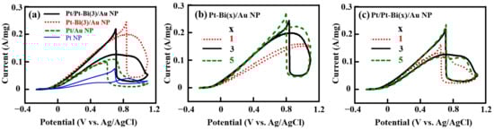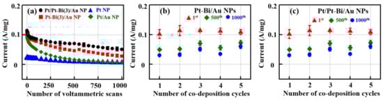 Figure 7b,c summarize the FAO current variations of Pt-Bi/Au NPs and Pt/Pt-Bi/Au NPs. As demonstrated in Figure 7b, the FAO currents of Pt-Bi/Au NPs in the first cycle are similar to each other within experimental uncertainties, regardless of the number of co-deposition cycles, and the rather wide deviations denote a difficulty in the control of the Pt-Bi/Au NPs in a precise manner. The FAO currents in the 500th voltammetric scan decrease to the level of ~0.04 A/mg, and those in the 1000th cycle become fairly constant at a value of 0.027 A/mg on average. In particular, the small deviations in the 1000th cycle certainly indicate that, during the FAO cycling, the surfaces of Pt-Bi/Au NPs converge to a certain state regardless of the number of co-deposition cycles. On the other hand, the FAO currents of Pt/Pt-Bi/Au NPs (Figure 7c) in the first cycle are also relatively similar to each other and comparable to those of Pt-Bi/Au NPs; moreover, the uncertainties are relatively smaller, supporting the idea that the surfaces of Pt/Pt-Bi/Au NPs are more controllable. The FAO currents in the 1000th cycle become 0.042 A/mg on average, higher than those of Pt-Bi/Au NPs (0.026 A/mg) and much better than that of Pt NP by a factor of 7.