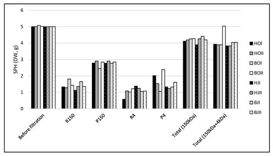 UF of the eight SPH from enzymatic hydrolysis of saithe heads (H) and backbone (B), in two bioreactors (I, II), from October (HOI, HOII, BOI, BOII) and January (HJI, HJII, BJI, BJII) resulted in a mass distribution presented in Figure 1. Filtration over 150 kDa MWCO ceramic membranes resulted in 1.42 ± 0.08 g SPH in R150 and 2.78 ± 0.05 g SPH in P150, which equals a protein yield of 56% in P150. The subsequent UF over 4 kDa cut-off PESH membranes resulted in 1.08 ± 0.08 g SPH in R4 and 1.56 ± 0.16 g in P4, which is equivalent to a protein yield of 31% of the initial 5 g of SPH in P4. The total protein loss from both filtrations was 19%.