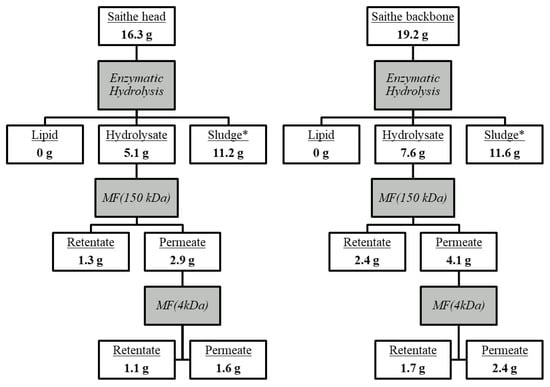 Based on an initial protein content of 16.3% and 19.2% in saithe head and backbone, respectively [], enzymatic hydrolysis followed by UF over 150 kDa and 4 kDa MWCO membranes would give a processing protein flow, as presented in Figure 2.