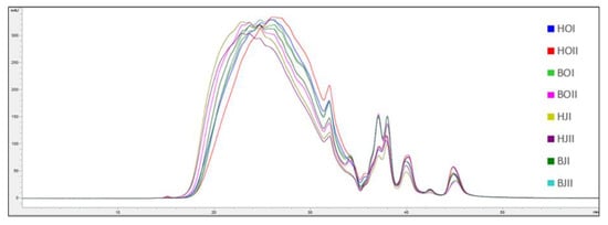 Chromatograms (mAU/min) from analysis of molecular weight distribution ( ± SEM, n = 2) of saithe protein hydrolysates obtained from enzymatic hydrolysis of heads (H) and backbones (B), in two bioreactors (I, II), from saithe caught in October 2019 (HOI (blue), HOII (red), BOI (green), BOII (pink)) and January 2020 (HJI (beige), HJII (purple), BJI (dark green), BJII (turquoise)).
