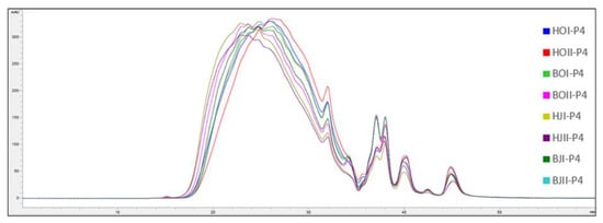 Chromatograms (mAU/min) from analysis of molecular weight distribution ( ± SEM, n = 2) of permeates (P4) after ultrafiltration (<4 kDa) of saithe protein hydrolysates obtained from enzymatic hydrolysis of heads (H) and backbones (B), in two bioreactors (I, II), from saithe caught in October 2019 (HOI-P4 (blue), HOII-P4 (red), BOI-P4 (green), BOII-P4 (pink)) and January 2020 (HJI-P4 (beige), HJII-P4 (purple), BJI-P4 (dark green), BJII-P4 (turquoise)).