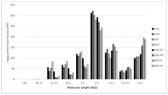 Molecular weight distribution ( ± SEM, n = 2) of saithe protein hydrolysates (SPH) (HOI, HOII, BOII, BOII) and their corresponding permeates (HOI-P4, HOII-P4, BOI-P4, BOII-P4) after ultrafiltration (<4 kDa). SPH were obtained from enzymatic hydrolysis of heads (H) and backbones (B), in two bioreactors (I, II), from saithe caught in October 2019 (HOI, HOII, BOI, BOII).