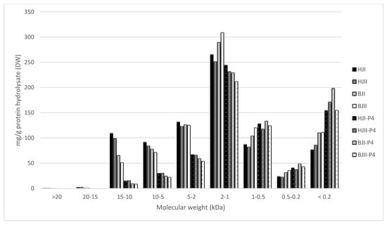 Molecular weight distribution ( ± SEM, n = 2) of saithe protein hydrolysates (SPH) (HJI, HJII, BJII, BJII) and their corresponding permeates (HJI-P4, HJII-P4, BJI-P4, BJII-P4) after ultrafiltration (<4 kDa). SPH were obtained from enzymatic hydrolysis of heads (H) and backbones (B), in two bioreactors (I, II), from saithe caught in January 2020 (HJI, HJII, BJI, BJII).