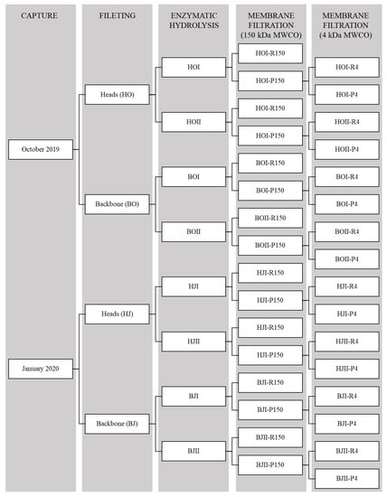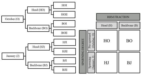 The experimental procedure was conducted as described by Hjellnes, Rustad, and Falch [] following the factorial design illustrated in Figure 7. Saithe were caught in Trondheimsfjorden, Norway, at two separate occasions: pre-spawning saithe in October 2019 (O) and spawning saithe in January 2020 (J). The fish was hand filleted, and the RRM was separated into three fractions: viscera (V), head (H), and backbone (B). Heads and backbones were used for further analysis.
