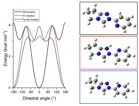 ) obtained by DFT calculations using a B3LYP (6–311G++(d,p) basis set [84,85,86], PCM water [87]). The inset ball and stick diagrams show the structures corresponding to the lowest energy conformations of N-pyrid-2-yl triazolium monocation 6 (