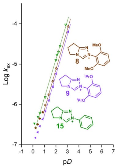 Figure 9 shows the corresponding log kex–pD profiles for 8 and 9. For comparison, Figure 9 also includes log kex–pD data for N-phenyl triazolium tetrafluoroborate 15 taken from our previously published studies [61]. In both cases, the profile is mostly described by a region of +1 slope consistent with the mechanism in Figure 6. There is evidence of some slight upward deviation from the line of +1 slope for a few datapoints at the lowest pD values. Equation (5) is a simplified form of Equations (3) and (4) [82], which only allows for a first-order dependence on DO–. To determine a kDO value, only datapoints that fit a line of unit slope were included (open symbols), and those showing slight upward deviation (filled symbols) were excluded from the kinetic fitting to Equation (5). The slight upward deviation is not significant enough to justify application of Equations (3) or (4) for kinetic fitting.