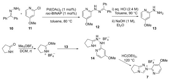N-pyrid-2-yl triazolium tetrafluoroborate 6 was prepared as described previously [63]. A synthesis of N-5-methoxy-pyrid-2-yl triazolium salt 7 was not reported previously, and we employed the route shown in Scheme 1. A Buchwald–Hartwig amination [78,79,80] using benzophenone hydrazone 10 and 2-chloro-4-methoxypyridine 11 was employed, which yielded N-aryl hydrazone 12. Subsequent acid-catalyzed hydrolysis, initially to the hydrazinium chloride, followed by neutralization using sodium hydroxide, yielded the aryl hydrazine 13. Onward conversion to triazolium tetrafluoroborate 7 employed the widely used method reported by Rovis [81]: reaction of aryl hydrazine 13 with 5-methoxy-3,4-dihydro-2H-pyrrol-1-ium tetrafluoroborate yielded amidrazone 14 with subsequent cyclization being elicited by triethylorthoformate to afford 7. The X-ray crystal structures (CCDC 2100846–2100847) obtained in the course of this work of both triazolium tetrafluoroborate salts 6 and 7 are shown in Figure 3.
