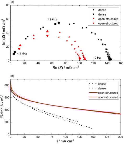 However, the rate-limiting reaction under fuel cell conditions is the ORR at the cathode. In general, it is assumed that a structure-induced improvement of the anode performance has an equal performance-enhancing effect on the cathode [20,33]. The cathode performance is analyzed using the polarization curves shown in Figure 3b. Over the entire potential range, the open-structured MEA has a lower overpotential than the dense cell. For a rough comparison, the i·R-free overpotential at a current density of 50 mA cm−2 is reduced by 40% for the open-structured MEA. The enhanced Pt utilization of (2.0 ± 0.1) g kW−1 for the open-structured cell is comparable to the results of Wagner et al. but is still insufficient to address the 2020 target of DOE for a total platinum-group metal loading of only 125 mg kW−1 [20,32].