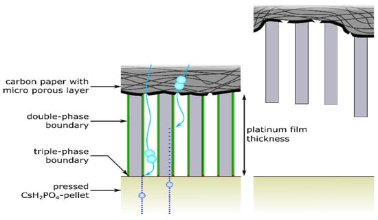 For the decarbonization of the energy sector, fuel cells are already a key technology in the transition towards the increasing use of renewable energy sources. Energy output from renewable sources is usually fluctuating, depending, for example, on wind and sunshine, which call for energy storage and conversion solutions. Fuel cells can convert chemical into electrical energy without producing greenhouse gases. Their construction consists of an electrolyte that is sandwiched between catalyst-coated gas diffusion electrodes. By selecting the electrolyte, the operation temperature can be adapted to the requirements. In particular, intermediate temperature fuel cells are of growing interest [1,2,3]. One representative of this class is the solid acid fuel cell (SAFC) which utilizes a proton-conducting solid acid electrolyte, such as CsH2PO4, at an operating temperature near 520 K [4,5]. SAFCs combine highly attractive attributes such as fuel flexibility (e.g., methanol, ethanol or reformate), enhanced resistance against catalyst poisoning, improved kinetics, an all-solid-state system and a non-toxic electrolyte [6,7]. Platinum (Pt) is the most common electrocatalyst for SAFCs due to its high activity and stability. For SAFCs, various deposition and fabrication methods have been investigated, resulting in different electrocatalyst microstructures and electrode architectures [7,8,9,10,11,12,13,14,15]. The deposition methods included metal-precursor impregnation, metal-organic chemical vapor deposition (MOCVD), atomic layer deposition (ALD) and direct current magnetron sputtering (dcMS), and these methods were utilized on the current collector as well as the electrolyte particles. Consequently, a large variety of fuel cell performances have been achieved. In particular, Pt composite electrodes have demonstrated power densities of 415 mW cm−2 and performance degradation of just 110 μV h−1 at 200 mA cm−2 [12,13,14]. Nevertheless, the performance was achieved with a high Pt loading of greater than 1 mg cm−2 per electrode, indicating a broad research field to enhance SAFCs in terms of power output at reduced Pt loading, hence at a lower cost. In other types of fuel cells, the electrode microstructure of Pt and other electrocatalysts has been modified using additives, electrodeposition and nanocages [16,17,18].