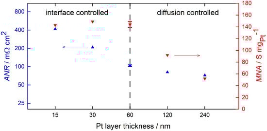 The results can be interpreted as follows. With increasing layer thickness, the electrodes become more and more active, indicating the importance of the double-phase boundary on the overall catalytic activity of the open-structured MEA. Considering the trend of the MNA, two regimes can be distinguished. The first regime goes up to a film thickness of 60 nm. For this regime, the whole Pt loading is equally available to contribute to the HOR. Thus, no diffusion limitation can be derived for this regime. Assuming that the triple-phase boundary activity is independent of the layer thickness, it can be concluded that there is no additional contribution of triple-phase boundary sites on the catalytic activity of the electrode. Otherwise, the MNA would increase for thinner films. In summary, the HOR for the first regime is rate-limited by the reactions at the interfaces between gas/catalyst or catalyst/electrolyte.