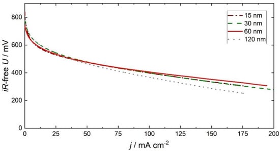 Polarization curves of the MEAs with open-structured GDEs possessing different layer thicknesses from 15 nm up to 120 nm at the cathode and a 60 nm-thick open-structured GDE at the anode under fuel cell operation conditions (513 K, 30 sccm O2, 30 sccm H2, 0.3 atm H2O).