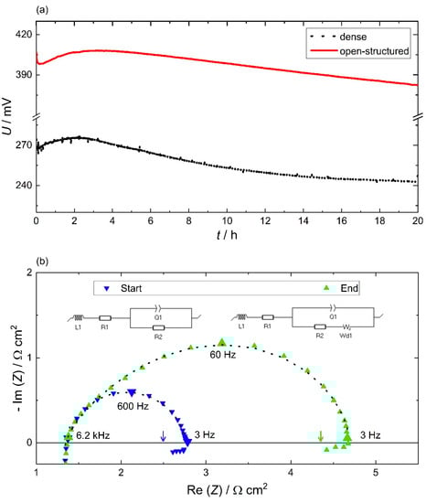 Electrochemical impedance spectroscopy was performed under anodic fuel cell conditions to investigate the HOR. The Nyquist representation of the GDE impedance is shown in Figure 3a. For all measurements, the impedance data consist of a capacitive, depressed semi-circle arc for which the width was used to determine the area-normalized resistance (ANR). The averaged ANR of the open-structured and dense electrode is (104 ± 3) mΩ cm2 and (144 ± 1) mΩ cm2, respectively. It is remarkable that the 30% performance improvement of the open-structured GDE is achieved with only half of the Pt loading. Therefore, it is essential to calculate the mass-normalized activity (MNA) from the inverse of the ANR divided by the Pt loading. The MNAs for the dense and open-structured GDE are (51 ± 1) S mgPt−1 and (144 ± 5) S mgPt−1, respectively. The MNA of the open-structured Pt film is more than twice compared to the best results for SAFCs presented by Thoi et al. (61 S mgPt−1) [11]. Here, the MEA with open-structured GDE is the first electrode for SAFCs that combines an encouraging performance with a Pt loading of 134 μg cm−2 that approaches the target of the DOE of 125 μg cm−2 per cell [32].