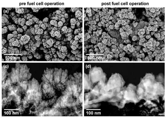 Representative scanning (as top view, a,b) and scanning transmission (as cross-section, c,d) electron micrographs of the open-structured GDE pre (a,c) and post (b,d) 60 h of fuel cell operation.