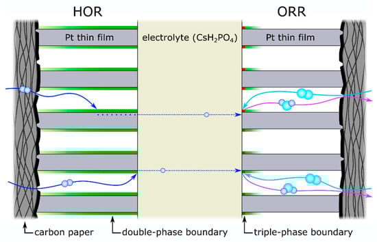 For the ORR, the reaction mechanism is much more complex and involves multiple transition states [21,22]. Based on our measurements with varied film thicknesses and the reaction mechanism, we conclude the dominance of the triple-phase boundary activity (Figure 9). Moreover, the thermally induced sintering process results in an unstructured thin film in which the electrochemical impedance data indicate a finite-length Warburg diffusion element. This element may indicate the diffusion of adsorbed oxygen or water through the sintered catalyst film [50,51]. Therefore, we assume that the sintered microstructure of the degraded open-structured thin film possesses diffusion pathways through the film of a few nanometers in thickness. In view of the similar behavior of the hydrogen diffusion through a dense Pt film, we assume that the ORR has an active double-phase boundary within a few nanometers of diffusion length on the surface of the Pt columns.