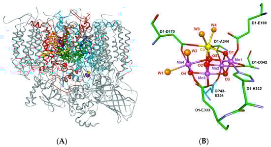 Photosystem II utilizes visible light to convert water into dioxygen at the catalytic tetranuclear manganese-calcium-oxo (Mn4Ca-oxo) cluster in the oxygen-evolving complex (OEC). The Mn4Ca-oxo cluster in the OEC has a distorted cubane-like structure with three manganese (Mn1–Mn3), one calcium, and four oxygen (O1–O3 and O5) atoms and a ‘dangling’ manganese atom (Mn4) that is linked to the cubane through di-μ-oxo linkages to the O atoms, O5 and O4 (numbering of the atoms is shown in Figure 1B) []. In addition to the μ-oxo-bridged oxygen atoms, the Mn4 and Ca ions are coordinated by the water-derived ligands, W1, W2 and W3, W4 [,,,], respectively, as well as one imidazole and six carboxylate ligands that are derived from the amino acid residues in the D1 and CP43 polypeptides of PSII (Figure 1B) [,,,]. The Mn4Ca-oxo cluster in the OEC is surrounded by additional amino acid residues and structured water molecules that form an extensive network of hydrogen bonds with the ligands of the Mn4Ca-oxo cluster and are thought to facilitate substrate water delivery, electron transfer, and proton egress during the water oxidation reaction [].
