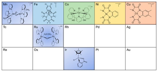 The 3d (Mn, Fe, Co, Ni, and Cu), 4d (Ru), and 5d (Ir) metals in the periodic table that have been incorporated in the design of synthetic bio-inspired molecular catalysts for water oxidation. Key examples of the catalysts that have been developed for each metal are also shown.