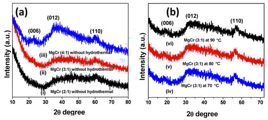 XRD spectra of exfoliated MgCr-LDH (2:1), MgCr-LDH (3:1), and MgCr-LDH (4:1) without hydrothermal ((a) (i–iii)); exfoliated MgCr-LDH (3:1) at different hydrothermal temperature of 70, 80, and 90 °C ((b) (iv–vi)).