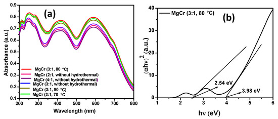 (a) UV-Vis DRS spectra of the series of exfoliated MgCr-LDH (2:1, 3:1, 4:1) without hydrothermal and MgCr-LDH (3:1) with hydrothermal treatment of 70, 80, and 90 °C. (b) Band gap energy of MgCr-LDH (3:1, 80 °C) as derived from Kubelka–Munk equation through Tauc plot.