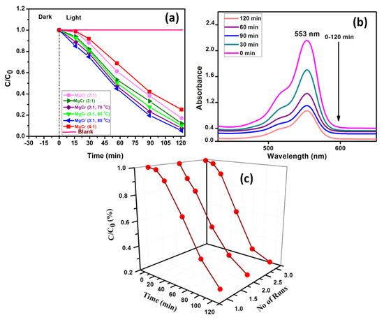 The order of intensification of RhB degradation for series of MgCr-LDH was 75% (MgCr 4:1), 85% (MgCr 2:1), 90% (MgCr 3:1), 93% (MgCr 3:1, 70 °C), 95% (MgCr 3:1, 80 °C), and 91% (MgCr 3:1, 90 °C), respectively (Figure 6a). These outcomes evidently show that (MgCr 3:1, 80 °C) exhibits enhanced RhB degradation. In addition, an excess substitution of Cr3+ to Mg2+ (MgCr 4:1) results decreases in activity because of the blocking of the reactive phases of MgCr-LDH. The rate of RhB degradation and related spectral changes of absorbance are depicted in Figure 6b. MgCr (3:1, 80 °C) shows excessive potential for maintaining higher stability approximately to the extent of 3 cycles (Figure 6c) than other as-prepared materials as discussed so far. The degradation activity results are in fine matching with the characterization results.