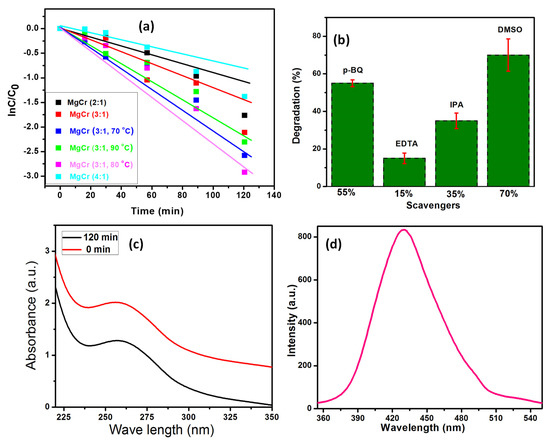 (a) Kinetics of RhB degradation by linear fitting of C0/C vs. time using a series of exfoliated MgCr−LDH samples. (b) Histogram showing % of degradation using different scavenging agents. (c) Absorbance plot of NBT by MgCr−LDH (3:1, 80 °C). (d) PL spectra of MgCr−LDH (3:1, 80 °C) by TA.