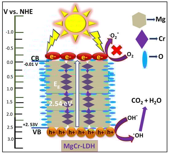 Based on the activities in scavengers test along with band edge position, the mechanism of charge separation in MgCr-LDH (3:1, 80 °C) for enhanced RhB degradation could be explained by following Equations (5)–(8):