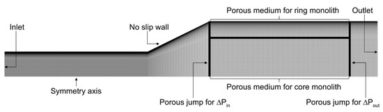 The values of the constants and blending functions, Equations (4) to (6), can be found in [24,25]. The term in Equation (2) had a nonzero value only inside the porous medium and was used to account for the extra head loss due to flow passing through the monolith. This part of the domain contained the core and peripheral monoliths and was modeled using the continuum approach. The apparent permeability was computed with Darcy’s Law, in the form of the momentum sink term ():