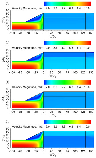 Figure 3 shows the velocity over the domain for four cases. In two of the cases, (a) and (c), the ring and core had the same cell density. In those cases, the flow distribution was fairly homogeneous and similar between them, as can be seen in the velocity profile at the exit face of the substrate in Figure 3. On the other hand, for cases (b) and (d), where the core and ring had different cell densities, the flow distribution was largely affected by the combination of cell densities. The role of the diffuser is to spread the flow more uniformly across the face of the monolith; however, usually, the majority of the flow remains concentrated in the central section. Therefore, one might expect that, regardless of the cell densities used, the bulk of the flow might pass through the central zone. However, we observed a different behavior; indeed, the flow pattern in the diffuser has only a minor effect on the flow distribution when dual-zone monoliths are used. The main factor that determines the flow distribution in this case is the difference in the viscous resistance of the two monolith regions (core and ring). This can be observed in Figure 3. Comparing the permeability of the ring and core monoliths is indirect because the flow model considers the hydraulic entrance length. However, a quick inspection can be performed by analyzing their asymptotic friction factors in the fully developed region—that is, by comparing the factor of both monoliths. According to the data in Table 1, the apparent permeability of the 900/2.5 monolith is only 40% lower than that of the 400/6.5 one. However, such a difference is sufficient to impact significantly the flow distribution.