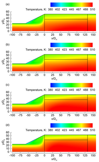 Temperature distribution. (a) 400c/400r, (b) 400c/900r, (c) 900c/900r, and (d) 900c/400r.