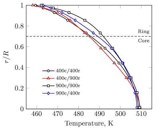 In agreement with the contour plots in Figure 4, the temperature profile at the outlet of the catalytic region of the four cases was also very similar (see Figure 6). Opposite to the flow distribution, there were no breaks or strong changes in tendency in the computed temperature profile, despite the transition of the cell count between the ring and core.