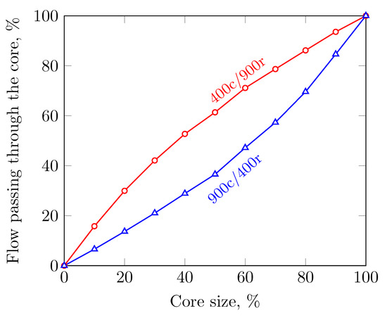 Percentage of the flow passing through the core as a function of the core size.