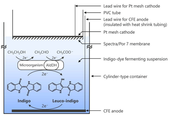 The indigo-dye fermenting suspension (100 mL) was poured gently into a cylinder-type container in which CFE (ca. 0.8 cm2, B0050, Toray, Japan, containing 17% of binder, basis weight = 50 g m−2) was already placed at the bottom. The CFE was sandwiched between Ti-mesh (Nilaco corp., Tokyo, Japan) and wrapped with 0.50 mm diameter Ti-wire (Nilaco corp., Tokyo, Japan). The Ti-wire was protected by heat shrink tubing and pulled out to the top of the cell as a lead wire. Thereafter, the container was stored overnight without deaeration. A polyvinyl chloride (PVC) tube (inner diameter: 13 mm) attached to a Spectra/Por 7 membrane (Repligen, Waltham, MA, USA) at the bottom was placed on the surface of the indigo-dye fermenting suspension. A Pt mesh (ca. 0.8 cm2, PT-358080, 80 mesh, Nilaco corp., Tokyo, Japan) was placed at the top of the membrane (Figure 1).